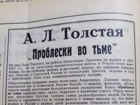 А словарь пишет, что дочь писателя А. Л. Толстая 1920-1921 гг. просидела в заключении в советском лагере. Сама же А. Л. Толстая прежде публично написала в эмиграции в 1953 году, что "просидела в тюрьмах" СССР (!) "пять с половиной лет". (Дом у дороги в жизнь (Речь А.Л. Толстой) // Свобода. Орган ЦОПЭ. #16. Сентябрь 1953. (Мюнхен). С. 9).