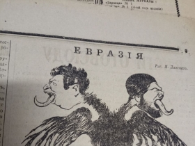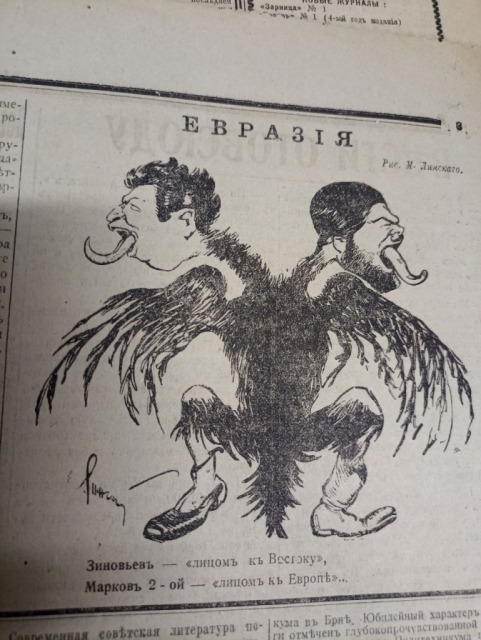 Газета Милюкова о евразийстве. Очень тонкое и политически невозможное соединение: слева генерального секретаря Коммунистического Интернационала Григория Зиновьева (Радомысльского) и справа вождя русских националистов и антисемитизма Николая Маркова 2-го.