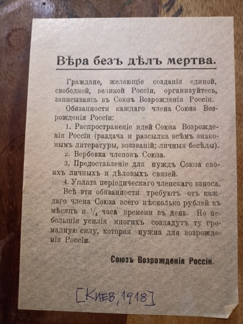 Листовка Киевского отдела подпольного "Союза Возрождения России" (весна 1918)