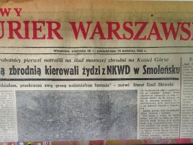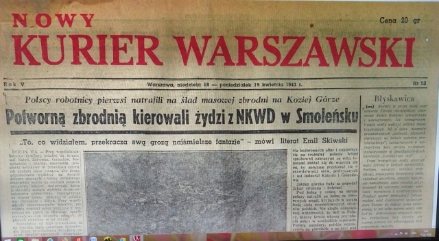 Одна из первых публикаций о расстреле польских офицеров в Катыни. Опубликована в "польской" газете периода гитлеровской оккупации. Заголовок: "Чудовищным преступлением руководили евреи из НКВД в Смоленске"